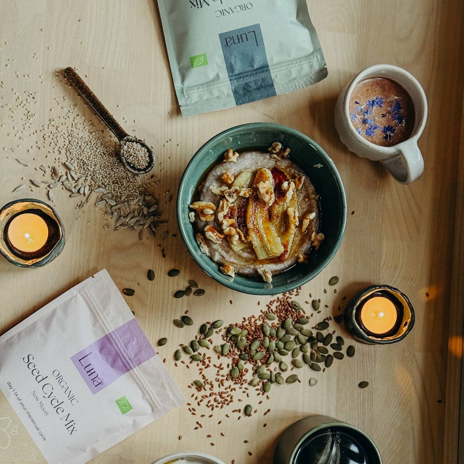 Seed Cycling is a simple and natural method where you follow your cycle and incorporate different seeds into your diet at the right time of the month. It’s a gentle way to support your hormonal balance and help your body feel its best throughout the entire cycle. Learn more about Seed Cycling here.